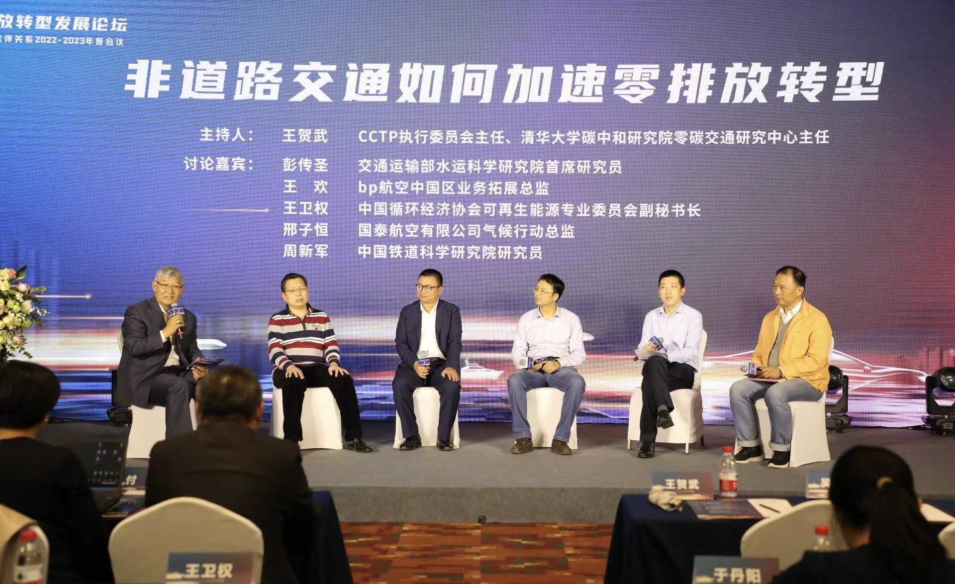 The roundtable discussion session was chaired by Hewu Wang. The Chief Researcher of the China Waterborne Transport Research Institute, Chuansheng Peng; the Director of Business Development for Air BP in China, Huan Wang; the Deputy Secretary-General of the Renewable Energy Committee at the China Association of Circular Economy, Weiquan Wang; the Climate Action Director of Cathay Pacific Airways Limited, Ziheng Xing; and the Researcher at the China Academy of Railway Sciences, Xinjun Zhou, participated in a profound discussion on the topic of "Accelerating Zero Emission Transformation in Non-Road Transportation." The discussion focused on aviation, railways, water transport, and renewable energy.