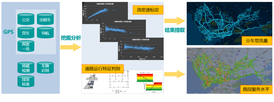 中观层面的核算包括对路网交通量动态推算,路段级交通排放核算、交通需求模型、动态流量推算及本地化排放因子等。如交通需求模型通过关联挖掘公交、出租车、货车等多源GPS、地磁检测、视频卡口、车牌识别、车辆排放标准等数据,开展交通需求测算与标定,提取全路段交通需求(分车型流量)与运行特征(服务水平)状态,从而分析路网动态交通的需求与运行特征。