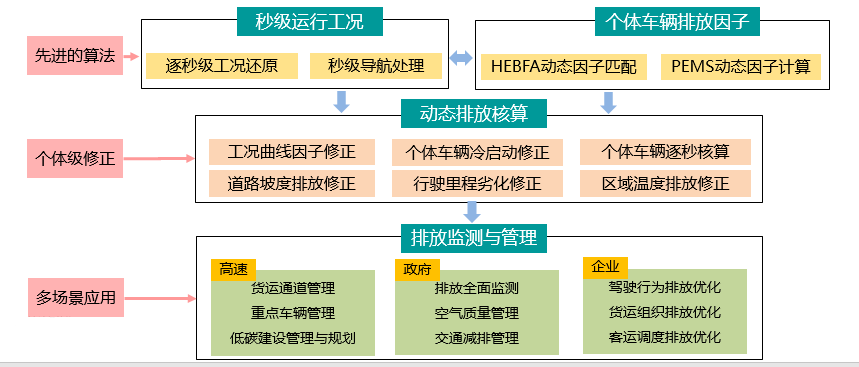 深圳市采用的微观层面核算还原了个体车辆逐秒运行轨迹、对车辆排放因子进行了细化并且纳入了新能源车辆能耗因子,考虑了车辆载重、道路坡度与环境温度对排放因子的影响。以对个体车辆的动态排放核算为例,该核算以车辆秒级运行工况为核心,动态标定个体车型排放因子,精确核算目标车辆排放,面向运营车辆碳排管理和企业节能减排业务,构建排放监测-交通管理与减排的排放监测闭环业务系统。
