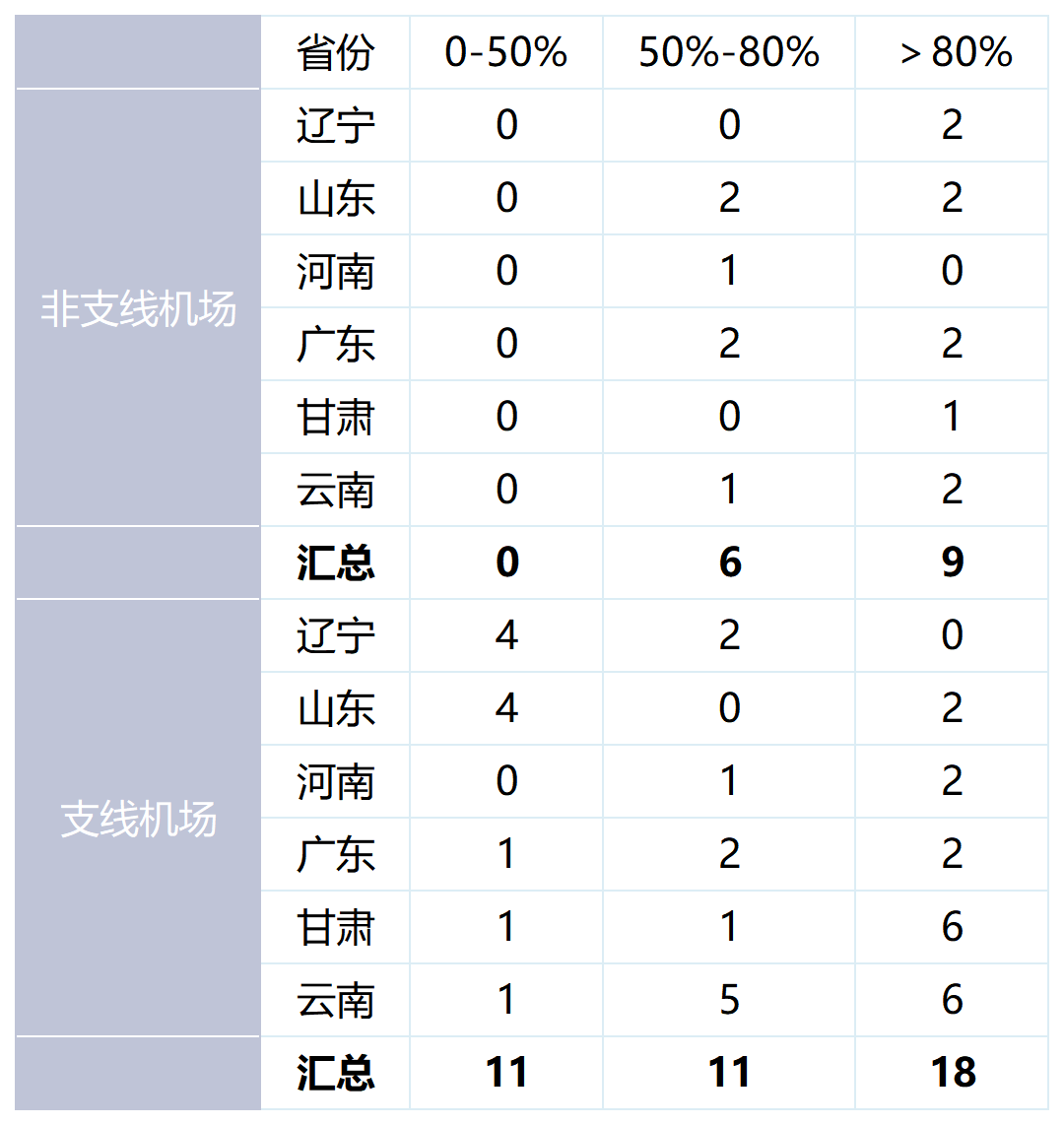 对民航客运机场而言,非支线机场能力利用率较高,所有干线与枢纽机场能力利用率在50%以上。据对部分省区机场的抽样统计,支线机场能力利用率总体偏低,超过1/4的支线机场利用率小于50%,利用率在50-80%的机场也超过了1/4。