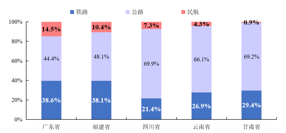在客运量占比方面,东部省份铁路、民航客运量占比显著高于西部地区;东南沿海及旅游省份的民航客运量占比相对较高。西部地区主要依赖公路运输,公路客运量占比超过65%。