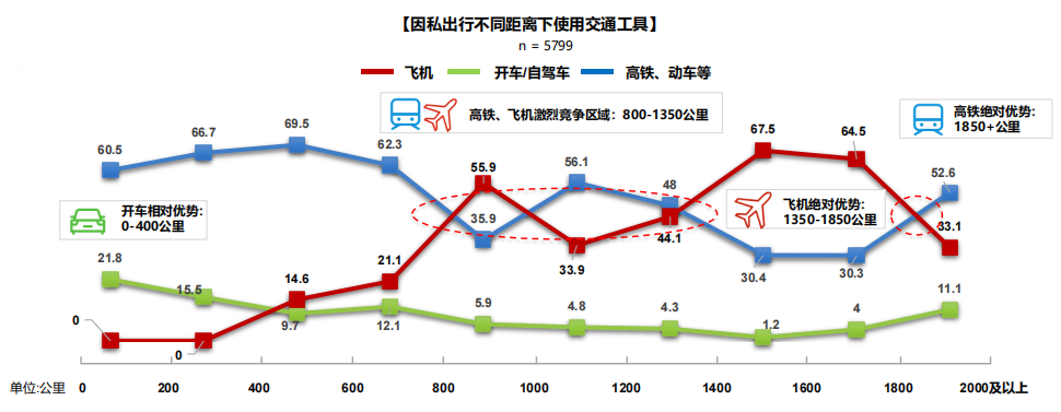 在大约0-400公里范围内,自驾车的选择多于飞机却少于高铁;在大约800-1,350公里范围内,高铁、动车与飞机彼此竞争非常激烈;当出行距离在1,350-1,850公里范围时,飞机的优势明显;而距离达到1,850公里以上时,高铁优势再次凸显,再次成为最主流的交通工具。