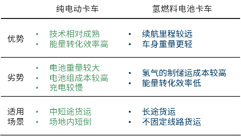 图1 纯电动重卡与氢燃料电池重卡优劣势对比