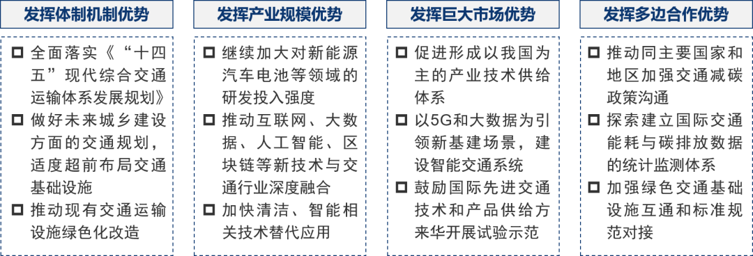 《巴黎协定》要求全球于本世纪后半叶实现净零排放,并且将全球温升控制在1.5℃以下。在此背景下,目前已有超过130个国家和地区提出了实现“零碳”或“碳中和”的气候目标,其中欧盟、英国、日本、韩国等17个国家和地区已有针对性立法。比如近年来欧盟就已经围绕交通减碳针对不同交通细分领域,推出了一系列综合性举措。聚焦国内,在加速推动交通运输领域实现低碳绿色转型的进程中,我国也已形成了较为强劲的发展优势。(下图总结了主要的四大优势)