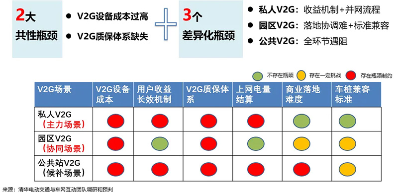 针对不同场景,瓶颈表现有所差异:私人V2G除共性瓶颈外,还缺乏上网电价与并网结算机制,导致用户“无收益”,商业模式难以闭环。但其标准化程度高、复制快,对行业级标准依赖度低,一旦政策打通,最易实现规模化推广。园区V2G虽已具备峰谷套利机制,但需协调多方主体,兼容多品牌车辆,落地复杂度较高。公共V2G则因用户体验成本高、需专门前往放电点,商业化难度最大。