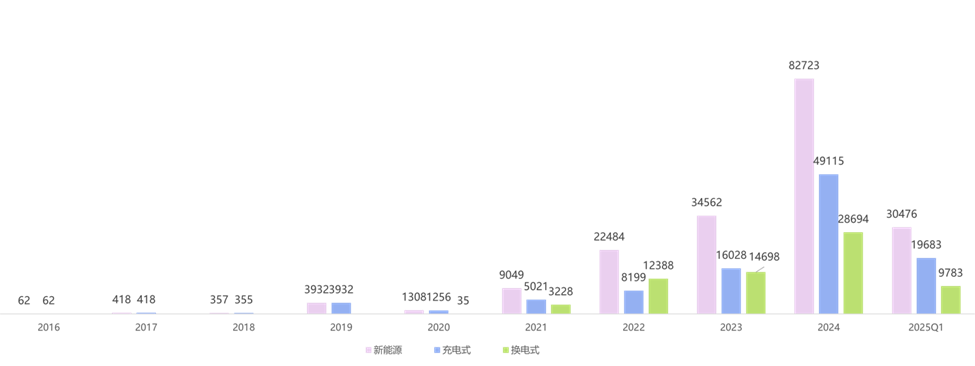图 2016-2025Q1 新能源重卡及不同补能方式电动重卡年度销量(辆)