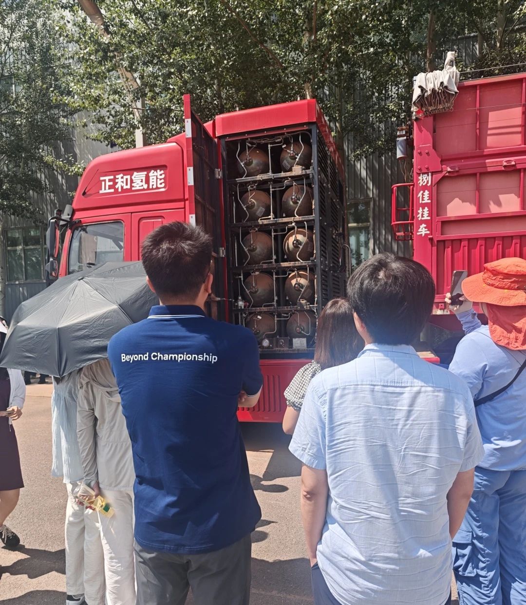 工作人员还向团队详细介绍了氢燃料电池车的核心配置:每辆车配备10个氢气瓶,共36kg氢气,续航可达300公里,满足正常卡车一天的里程需求。同时,工作人员对比传统电动汽车,突出了氢燃料电池车在加氢速度快、低温损耗小、续航里程长等方面的显著优势。